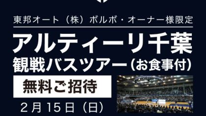 皆様こんにちは。セールスマネージャーのトウジョウです。今回はオーナー様イベントのご案内です。当社が応援しているB1リーグ所属のプロバスケットチーム「アルティーリ千葉」の試合観戦バスツアーご招待企画です! 参加条件:当社ご利用のボルボオーナ...